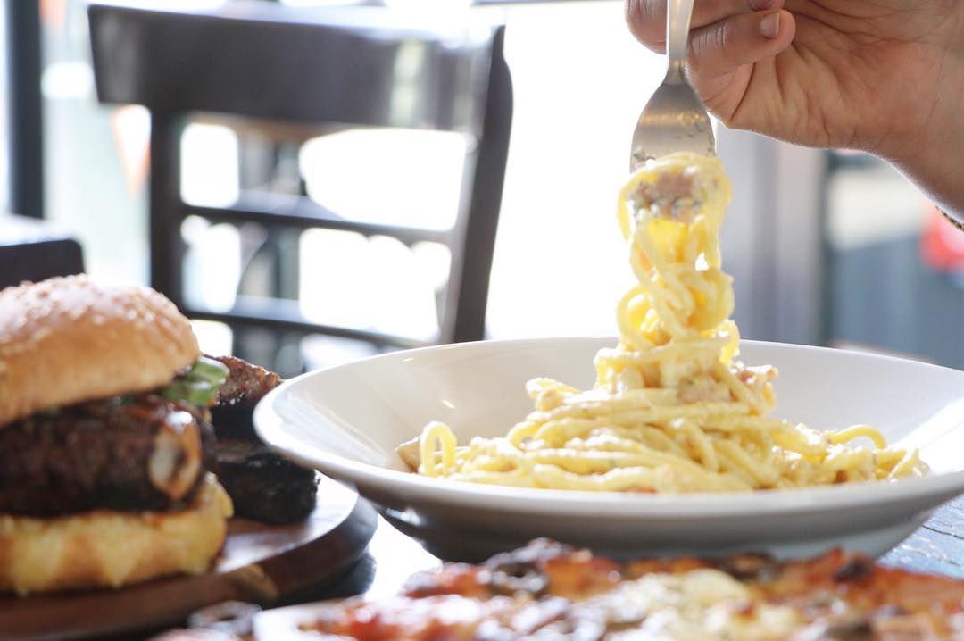 bacon, garlic, cream, parmesan, spring onion, black pepper