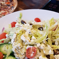 feta, lettuce, cucumber, red onion, olive, dressing, olive oil
